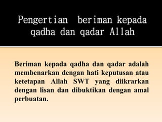 Pembahasan Iman kepada Qadha dan Qadar Merupakan keyakinan yang bahwasannya percaya terhadap ketetapan Allah. Menurut Muhammad Jabr al-Alfi. Political affiliation is unknown.
