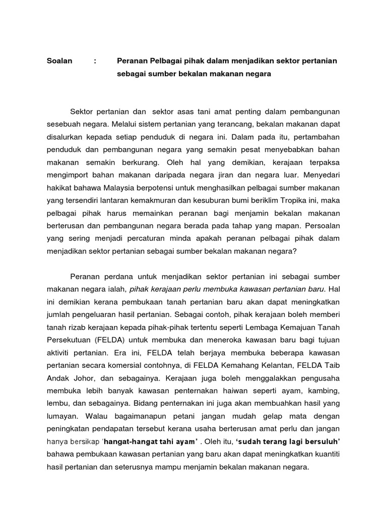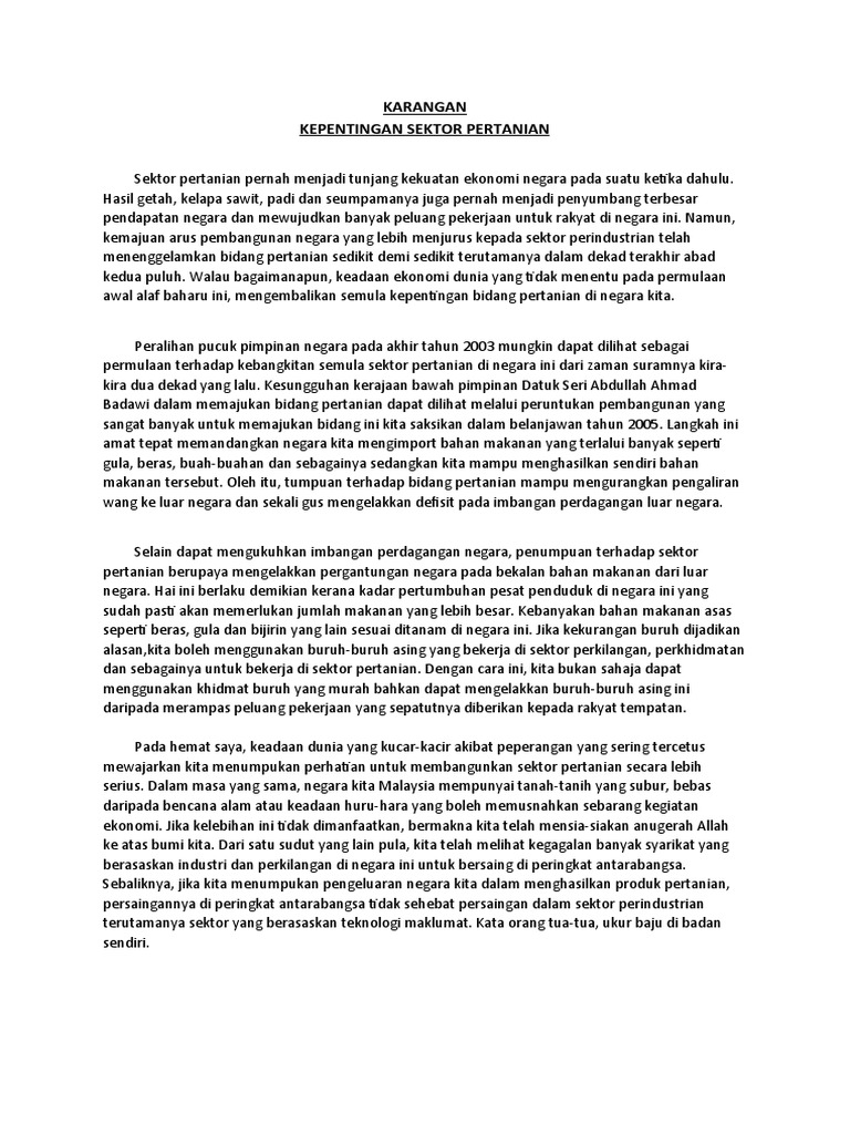 Penutup Karangan menarik menceburi bidang pertanian Secara keseluruhannya bidang pertanian merupakan sektor yang begitu dekat di hati rakyat namun haruslah diubah dan dilakukan anjakan paradigma agar siswazah yang melibatkan diri dalam sektor pertanian dapat berbangga kerana usaha mereka ini merupakan bukti mereka memiliki semangat cinta akan. Koleksi Karangan Esei Pengajian Am PA STPM 1Sijil Tinggi Persekolahan Malaysia. Pembangunan sektor pertanian harus sentiasa difokuskan untuk mewujudkan sebuah negara yang stabil dari segi kewangan ekonomi dan politik.